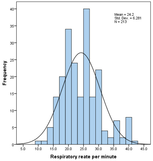 The mean respiratory rate in the population was 24.20 ± 6.28. The distribution of respiratory rate is presented in Figure 1. In total, 138 (64.8%) patients had increased effort of breathing.