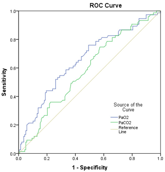Furthermore, the ROC-AUC analysis to determine the discriminative power of PaO2 and PaCO2 to determine the increased EOB was carried out, revealing PaO2 as the more accurate predictor, with ROC-AUC for PaO2 of 0.656 (CI 95%: 0.579–0.734, p < 0.001) vs. ROC-AUC for PaCO2 of 0.584 (CI 95%: 0.505–0.662, p = 0.043) (Figure 2).