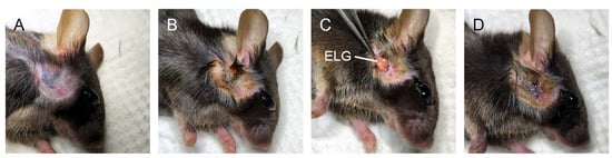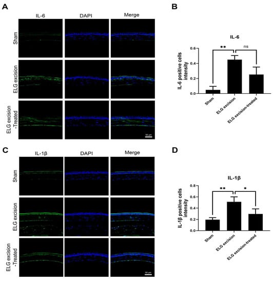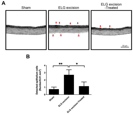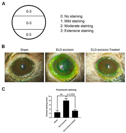 3.1. Decrease in Superficial Punctate Epithelial Erosions on the Corneas of ELG Excision Mice