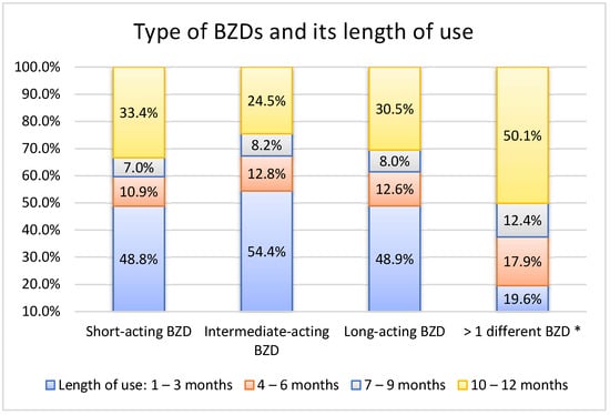 Length of use depending on the type of benzodiazepine (BZD). * A significant number of patients had used different types of BZDs during the surveyed time period.