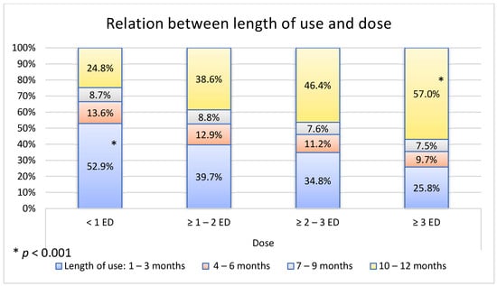The Kolmogorov-Smirnov test was used and a significant deviation from normal distribution of continual data was shown, which imposed a need for the implementation of nonparametric statistical tests. Descriptive statistics consisted of expressing the data as a mean with its standard deviation (SD) and a 95% confidence interval (CI). Patients who lacked data on a specific parameter were not included in the analysis. A chi-square test was used to analyse the connection between specific categorical variables. Continuous variables were analysed by the Mann-Whitney U-test or the Kruskal-Wallis test. Multiple regression analysis has been conducted to analyse the impact of different parameters on the main variables: the length of use and the dose. The statistical significance level was set at p < 0.05. Data were processed using IBM SPSS 18.0 software.