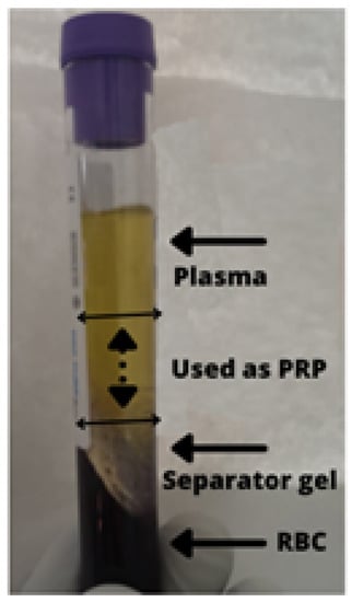 For the patients in the PRP and voice rest group, following induction anesthesia, venous blood was drawn in a 12 mL Standard Gel Separation PRP tube (HBH Medical®) (HBH Medizintechnik GmbH, Tuttlingen, Germany) under sterile conditions. A centrifuge (model XC-2415) (Merck KGaA, Darmstadt, Germany ) set at 4000 RPM for 5 min was used to separate platelets, as indicated by the provider. The upper two thirds, considered Platelet-Poor Plasma (PPP), was discarded. The lower one third, above the separator gel, was considered PRP (Figure 1). The PRP was aspirated in a 2 mL syringe, and a 26 G spinal needle(Shanghai Mekon Medical Devices Co. Ltd., Shanghai, China) was attached for delivery. Before injection, a fraction of the separated PRP was analyzed for the platelet count to ensure that the product met the minimal platelet concentration requirements to be considered PRP.