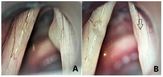 Suspended laryngoscopy with vocal fold cyst excision: (A) preoperative image of right vocal fold cyst and (B) postoperative image after hemostasis was obtained. The site of the injection is marked with an arrow.