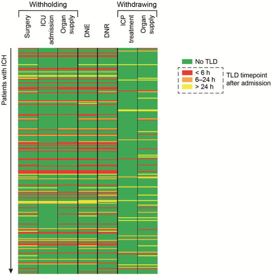 However, advanced directives (in writing) are often not available in emergency situations [], especially if elicited through multiple consultations with relatives. This circumstance often leads to a shift of decision-making responsibilities into the emergency room. Here, once the diagnosis has been made, initial treatment-related decisions are initiated (intubation, conservative intracranial pressure therapy, catecholamine therapy, etc.). In the present series, TLD had occurred in 42% of patients with ICH. This is a high number compared with reports about patients with severe traumatic brain injury (17%), supporting the importance of the present study []. One-half of all TLDs were reached within the first six hours of hospital admission, making it worthwhile to consider the manner of the obtained TLD. Thus, TLDs might be distinguished between withholding and withdrawing further treatment []. The former suggests a straightforward decision-making process at the onset of (any) therapy, whereas, in the case of withdrawing, additional diagnostic tests and/or discussions appear to be necessary in order to identify more precise prognostic factors. In the present study, a large proportion of patients with ICH and TLD were assigned to withholding therapy (58%). Therefore, based on the (potential) patient’s will and the corresponding clinical findings, decisions were made at an early stage that seem to have prevented unnecessary/unwanted therapies/interventions. That patients with ICH and need for TLD presented in clinically more deteriorated condition (cerebral herniation, ICH score > 3) than patients without TLD emphasizes the importance and influence of medical judgment of the likelihood/severity of potential impairment. Nevertheless, especially in the acute clinical picture of ICH, there is often the problem that a rapid surgical intervention, even in unawareness of the patient’s presumed will, may be necessary [,,]. According to the “hit hard and early” principle, a timely de-escalation in the sense of the patient’s will would then be possible in the short term after clarification of the further circumstances. Therefore, the integration of palliative/comfort care services into ICU workflow could be beneficial in the implementation of TLD and could prevent unnecessary interventions [].