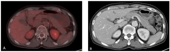 Pancreas findings before chemotherapy. (A) There was no finding of presenting malignancy in pancreas on PET CT. (B) No abnormal findings suggestive of acute pancreatitis were observed in CT.