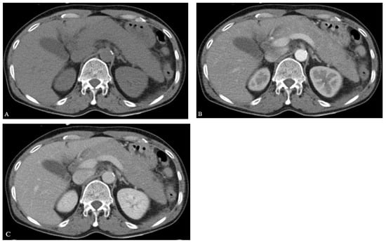 Pancreas finding during chemotherapy. Diffuse pancreas swelling was observed: (A) non-enhanced phase (B) arterial enhanced phase (C) venous enhanced phase.