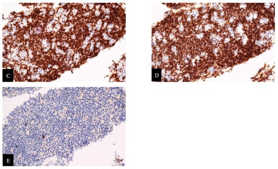 Pathologic findings. (A) Acinar cell structure is destroyed by diffusely infiltrated tumor cell (HE, ×100). (B) Irregular pleomorphic hyper-chromatin nuclei is observed (HE, ×400). (C,D) CD 3 and CD 56 is positive in immunohistochemical (IHC) stain. (E) CD 20 is negative in IHC stain.