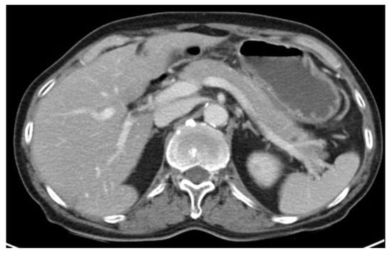 CT finding after 2 months. Pancreatitis is improved and no complication is observed.