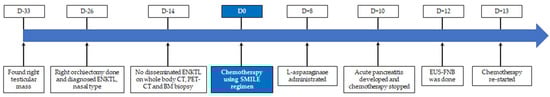 Therefore, he was given a final diagnosis of acute pancreatitis due to diffuse pancreas metastasis of ENKTL, and we resumed chemotherapy using the SMILE regimen. On the second day after fasting, epigastric pain and tenderness started to improve, and the patient resumed oral food consumption. In the follow-up CT performed after 2 months, pancreas enlargement was improved (Figure 5). The patient continued with his chemotherapy with the SMILE regimen, but refused to continue after the third cycle due to severe generalized weakness, and eventually died due to pneumonia. Figure 6 summarized our patient’s hospital course with timeline.