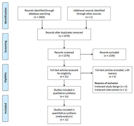 In total, 2403 records were identified through our database searches. A gray literature repository was also found. Two additional records were identified [13,14]. After removing duplicates, initial screening was performed for the titles and abstracts of 1370 records, and 1339 records were excluded. After the initial screening, screening of the full text of 31 articles was performed, and 5 full-text articles were excluded for the following reasons: nonrandomized articles (4 articles) [15,16,17,18] and different interventions (1 article) [19]. Two studies (two articles) were ongoing [20,21]. Finally, 12 RCTs (24 articles) that met the inclusion criteria were included for qualitative synthesis in this review. The assessment process is illustrated in the Preferred Reporting Items for Systematic Reviews and Meta-Analyses flowchart (Figure 1).