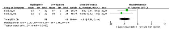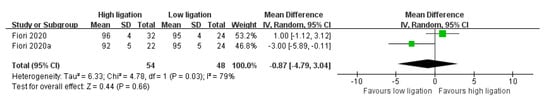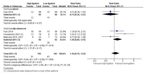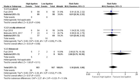 Table 2. Summary of findings: high ligation compared with low ligation in colorectal cancer surgery (primary and secondary outcomes, except for functional outcomes). - Postoperative complications; ten RCTs with 1293 participants (HL: 657 and LL: 636) were analyzed for postoperative complications [14,23,24,25,26,27,30,31,32,33]. There may be little to no difference in the postoperative complications between HL and LL (risk ratio (RR): 1.15, 95% CI: 0.87–1.52; I2 = 44%; low CoE) (Table 2). We downgraded the CoE due to serious study limitations and serious inconsistencies.