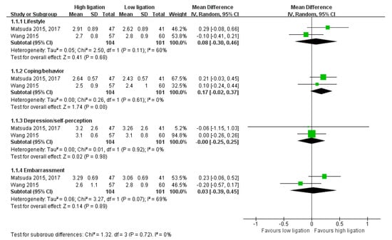 HL may reduce defecatory function (constipation) assessed with the AWCS (mean difference (MD): 1.63, 95% CI: 0.85–2.42; I2 = 64%; low CoE). There may be little to no difference in defecatory dysfunction assessed with the JWIS (MD: 0.42, 95% CI: 0.20–0.63; I2 = 0%; low certainty of evidence) and with the GIQLI (MD: −1.13, 95% CI: −3.32 to 1.06; low CoE). We downgraded the CoE of each questionnaire due to serious imprecision and serious study limitations (Table 3).