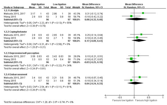 Analyses of 158 (HL: 84 and LL: 74) participants from two RCTs [26,27] for the IIEF-5 and 46 participants (HL: 22 and LL: 24) for the FSFI were performed. HL may reduce sexual function assessed with the IIEF-5 (MD: −5.11, 95% CI: −6.85 to −3.37; I2 = 0%; low CoE) and the FSFI (MD: −5.00, 95% CI: −6.74 to −3.26; low CoE) compared with LL (Table 4). We downgraded the CoE for each questionnaire due to serious imprecision and serious study limitations.