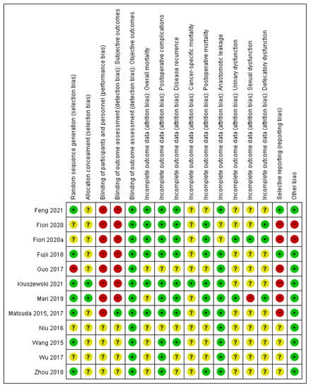 Risk of bias summary: Review authors’ judgments about each risk of bias item for each included study. Subjective outcomes: Postoperative complications, anastomotic leakage, urinary dysfunction, sexual dysfunction, and defecatory dysfunction. Objective outcomes: Overall mortality, disease recurrence, cancer-specific mortality, and postoperative mortality. Categories: Green point (+) = low risk of bias; yellow point (?) = unclear risk of bias; red point (−) = high risk of bias.