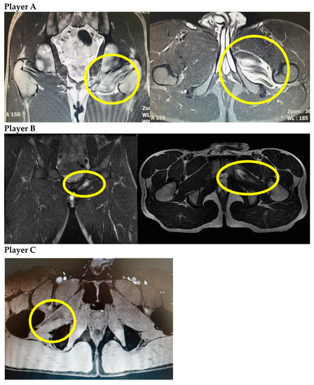 Between March 2021 and February 2022, three professional male soccer players recruited to the South Korea national team, presented with acute onset of groin and anterior hip pain. The pain was dull and achy. A 30-year-old player (Player A, 175 cm/73 kg, right leg dominant) and a 24-year-old player (Player B, 173 cm/68 kg, left leg dominant) complained of pain in the left side after long distance shooting during an in-season training session and a match, respectively. Another 24-year-old (Player C, 168 cm/65 kg, right leg dominant) player complained of pain in the right side after long distance passing during a preseason training session. All these players denied any numbness or weakness and radiating pain down to the legs. On inspection, there was no obvious bruising, ecchymosis, edema, or swelling. On palpation, there was no obvious tenderness. Active hip external rotation and passive hip internal rotation and extension elicited pain in all three players. These players were able to walk without limping.