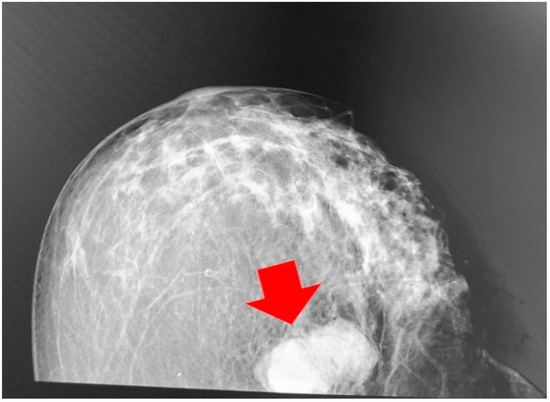 Findings from the mammography (craniocaudal position); a strong lobulated shadow can be observed (red arrow marks the breast LELC).