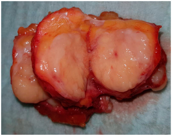 The physical examination revealed a palpable formation in the lower lateral quadrant of the right breast, with a size of about 40–45 mm, with a dense-elastic consistency, which was relatively mobile and painless. The overlying skin was intact. No other solid lesions were palpated in either mammary gland; there were no pathologically enlarged lymph nodes in either axilla. Upon hospital admission, a chest X-ray showed no pathology. An excisional breast biopsy was performed under general anesthesia. The resected formation was cut before fixation, presenting a non-encapsulated, circumscribed, nodular tumor 45/30 mm in size, with a dense-elastic consistency (Figure 2).