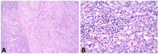 (A) Groups and strands of tumor cells, mixed with lymphoid stroma, HE 4x; (B) cells with pleomorphic vesicular nuclei, containing coarse chromatin, visible nucleoli and not abundant pale cytoplasm HE, 40x.