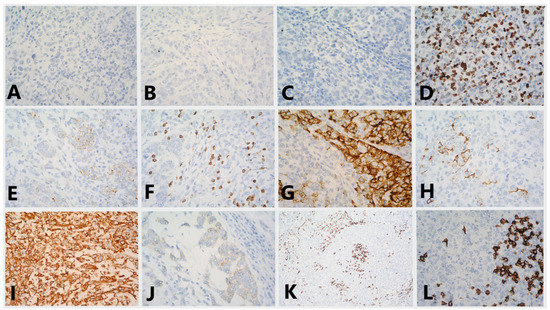 Immunostaining for (A) ER (lack of staining in the tumor cells, 40x); (B) PgR (lack of staining in the tumor cells, 40x); (C) HER2 (lack of staining in the tumor cells, 40x); (D) Ki-67 (variable staining in 50% of the tumor cells, 40x); (E) E-cadherin (moderately intense staining of cell membranes in 70% of the tumor cells, 40x); (F) p63 (nuclear positivity in about 20% of the tumor cells, 40x); (G) CK7 (strongly positive in about 40% of the tumor cells, 40x); (H) CK5/6 (weak staining in 2% of the tumor cells, 40x); (I) vimentin (strongly positive in the tumor cells, 40x); (J) CD117 (weak staining of the cytoplasm in 5% of the tumor cells, 40x); (K) CD3 (positive in T lymphocytes, 10x); (L) CD20 (positive in B lymphocytes, 40x).