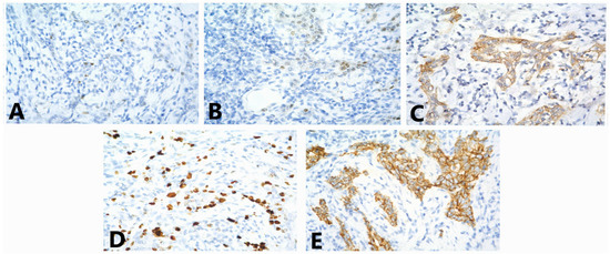 Immunostaining for (A) ER (weak nuclear staining in about 10% of the tumor cells, 40x); (B) PgR (weak nuclear staining in about 10% of the tumor cells, 40x); (C) HER2 (evaluated as 2+—moderately intensive, complete membrane staining, 40x); (D) Ki-67 index—30%, 40x; (E) E-cadherin (moderately intense staining of the cell membranes of the tumor cells, 40x).