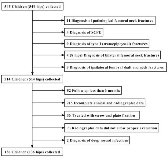 A total of 136 out of 545 children (25%) met the inclusion criteria; there were 79 (58.1%) boys and 57 (41.9%) girls. The remaining 409 patients (75%) were excluded for the following reasons: diagnosis of a pathological femoral neck fracture (n = 11; 2%); a slipped capital femoral epiphysis (SCFE) (n = 4; 0.7%); a Delbet–Colonna type I fracture (n = 9; 1.7%) [15]; bilateral fractures (n = 4; 0.7%); ipsilateral femoral shaft and neck fractures (n = 3; 0.6%); a follow-up <6 months (n = 52; 9.5%); incomplete clinical and radiographic data (n = 215; 39.4%); fracture treated with screw and plate fixation (n = 36; 6.6%); radiographs of poor quality not allowing proper evaluation (n = 73; 13.4%); and a diagnosis of deep wound infection (n = 2; 0.4%) (Figure 1).