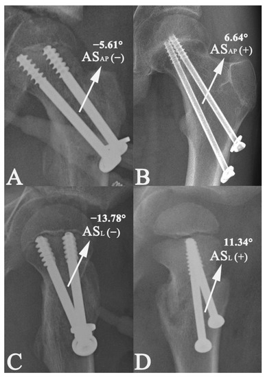 The angulation (AS) between the axis of two cannulated screws on anterior–posterior (ASAP) and lateral (ASL) radiographs were both measured and were expressed as degrees (°). The value of ASAP or ASL was defined as neutral (zero) if two screws were parallel, negative if two screws were divergent (˅-shape), and positive if two screws were convergent (˄-shape) (A–D).