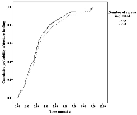 Cumulative probability of achieving radiological fracture healing according to the number of screws implanted.