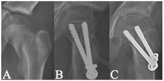 Radiographs of a 12-year-old boy with a displaced Delbet–Colonna type III fracture [15] (A); radiographs after open reduction and internal fixation with 2 cannulated ˅-shape screws; the fracture was completely compressed by the screws with the threads above the fracture line (B); the radiological healing at 3.5 months post-surgery (C).