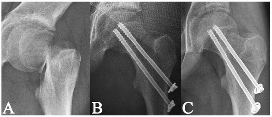- Wang, W.; Li, Y.; Xiong, Z.; Guo, Y.; Li, M.; Mei, H.; Shao, J.; Li, J.; Canavese, F.; Chen, S. Effect of the Number, Size, and Location of Cannulated Screws on the Incidence of Avascular Necrosis of the Femoral Head in Pediatric Femoral Neck Fractures: A Review of 153 Cases. J. Pediatr. Orthop. 2022, 42, 149–157. [Google Scholar] [CrossRef]