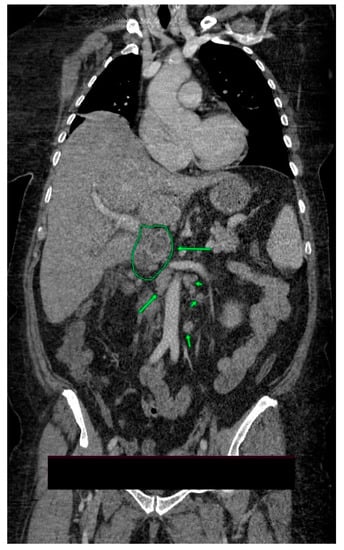 A 59-year-old female, known with stage 2 arterial hypertension, grade 2 obesity, with a history of cholecystectomy, was admitted for fever (38.5 °C), jaundice, and marked physical asthenia. The symptoms began about 3 weeks before admission and gradually worsened. The patient denied any significant family medical history. Upon examination, the patient was ill-appearing, conscious, with icteric skin, sclera, and mucous membranes, without any palpable lymph nodes; lung sounds were clear bilaterally, oxygen saturation 98–100% with additional oxygen on face mask; blood pressure of 98/58 mmHg and heart rate of 102 beats per minute; non-tender abdomen; acholic stool and hyperchromic urine. The neurological examination revealed no focal deficit. The laboratory tests showed severe metabolic acidosis with partial respiratory compensation, mild microcytic normochromic anemia, elevated acute phase reactants, procalcitonin ten times the upper normal limit, azotemia, hypoalbuminemia, hypertriglyceridemia, hypercholesterolemia, and moderate hyponatremia. The electrocardiogram and chest X-ray revealed normal findings. Abdominal ultrasound identified a normal-looking liver, without dilatations of intrahepatic or extrahepatic bile ducts, a spleen of 13 cm, without other pathological changes. Based on these results, the diagnosis of sepsis of unknown origin, jaundice, and acute renal failure was established. A gastroenterology consultation was requested, that excluded liver cirrhosis (due to the lack of clinical, serological, and imaging criteria), obstructive jaundice, and angiocolitis (absence of biliary ducts dilatations and biliary stones). The association of cholestasis, hepatocytolysis, and azotemia raised the suspicion of leptospirosis. This diagnosis was later refuted by performing anti-leptospira antibodies, with a negative result. A few hours after admission, the patient’s condition deteriorated, manifesting signs of septic distributive shock. The patient was transferred to the intensive care unit, where her condition remained severe, with hemodynamic instability and need for vasopressor support with norepinephrine in moderate doses. Infectious screening was performed and broad-spectrum antibiotherapy was initiated. Moreover, the CA 19-9 level was dosed, with values 20 times the upper normal limit, and CA-125 with values five times the upper normal limit. Contrast-enhanced abdominal pelvic computed tomography revealed a globally enlarged, irregularly shaped, inhomogeneous cephalic contours of the pancreas, with hypocaptive images and microcalcifications; peripancreatic fluid collections with a diameter of up to 2.5 cm, two cystic images with a diameter of 2.4 cm and 2.7 cm, respectively, that come in contact with the portal vein and the head of the pancreas (small pseudocysts), as well as multiple periaortic and interaortocaval lymph nodes with a maximum axial diameter of 17 mm (Figure 1). These findings raised the suspicion of acute-on-chronic pancreatitis.