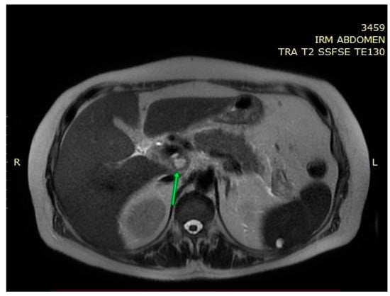 MRI can also provide valuable information to help establish the diagnosis of pancreatic tuberculosis []. De Backer et al. concluded that in cases of focal pancreatic tuberculosis, MRI evaluation may reveal a delineated pancreatic mass, with heterogeneous enhancement, most commonly located in the head of the pancreas []. In diffuse forms of pancreatic tuberculosis, MRI evaluation may show an overall increase in pancreatic size, with narrowing of the Wirsung duct and heterogeneous enhancement []. In T1 sequences, the lesions usually appear hypointense and in T2 sequences, hyperintense [,]. Peripancreatic lymphadenopathy can be frequently identified []. In our case, MRI identified a multicystic mass in medial contact with the pancreatic cephalic region. Considering its behavior in diffusion and postcontrast sequences, it raises the suspicion of pancreatic tumor. Peripancreatic lymphadenopathy, most commonly grouped in the vicinity of the left renal artery, was also identified.