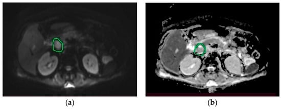 MRI. (a) Diffusion-weighted imaging (DWI) sequence: hyperintense cephalopancreatic lesion; (b) apparent diffusion coefficient (ADC) sequence: hypointense cephalopancreatic lesion.