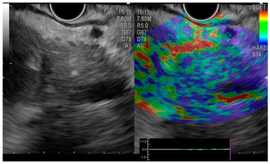 Endoscopic ultrasound elastography. Hypoechoic cephalic pancreatic lesion with mixed pattern.