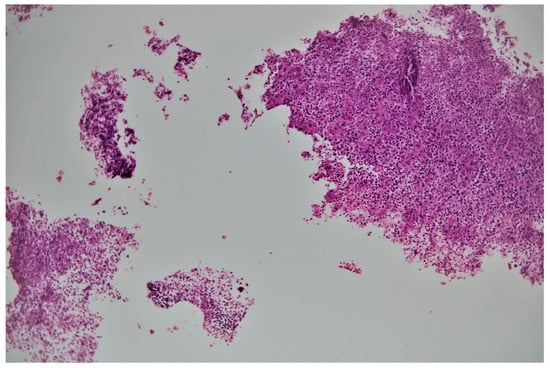 Currently, the imaging method of choice in patients with suspected pancreatic tuberculosis is EUS []. In addition to the imaging evaluation of the pancreas and peripancreatic lymph nodes, it allows the collection of biopsy samples by fine-needle aspiration/biopsy (FNA/FNB-EUS) []. Rana et al. compared the images obtained by echoendoscopy in two groups of patients: one group of 6 patients with pancreatic tuberculosis and the other group of 25 patients with pancreatic adenocarcinoma []. The differences were not significant. However, the age of patients with pancreatic cancer tended to be higher compared to those with pancreatic tuberculosis. Pancreatic cancer patients also had higher serum bilirubin levels, as well as more frequent changes in the size of the main duct bile and Wirsung duct []. FNA is the most feasible, non-invasive method that allows the collection of a tissue sample and subsequent histopathological examination [,]. The risk of sampled cells or microorganisms spreading is minor []. Bioptic samples from pancreatic lesions can also be obtained by CT-guided biopsy or laparoscopy []. In our case, FNA-EUS allowed the diagnosis of pancreatic tuberculosis.