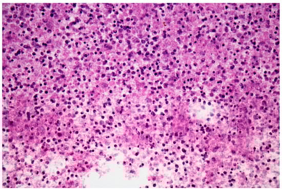 Hematoxylin-eosin stain 400×: necrotic material with lymphocytes, polymorphonuclear cells and cell debris.