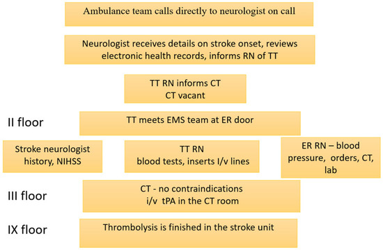 Thrombolysis protocol at WTCH 2014–2021. RN—registered nurse, TT—thrombolysis team, ER—emergency room, CT—computed tomography, EMS—emergency medical team, ambulance, tPA—tissue plasminogen activator, i/v—intravenous, NIHSS—National Institute of Stroke Scale.