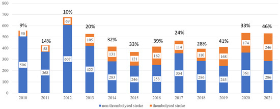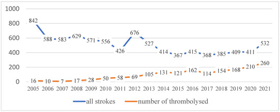 From 2005 to 2021, 8699 strokes have been treated at WTCH. Thrombolysis was performed in 1698 patients. The number of strokes and thrombolysis from 2005 to 2021 is depicted in Figure 2 and Figure 3.