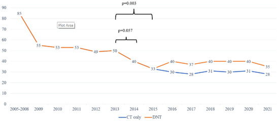 In addition, to shorten DNTs, we also observed a significant increase in the number of thrombolysed patients. In 2005–2008, we thrombolysed 7–17 patients annually. In 2021, 260 thrombolysis were performed, including 246 strokes and 14 stroke mimics (5%). Advanced imaging is also used in a proportion of patients without a certain time of onset. Since 2018, 14% to 21% of thrombolysis were performed after salvageable tissue was demonstrated by MRI.