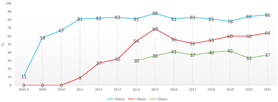 The mean DTN time was 85 min (93…84) from 2005 to 2008, with tendencies towards somewhat decreasing numbers. The DNT was unchanged after the new IVT standard procedure was introduced without lab results; INR POC was implemented in 2013. From November 2013, the EMS and Tallinn stroke centers agreed the prenotification of neurologists. At WTCH, the procedure was also changed to include the reviewing electronic health records before the patient’s arrival, the thrombolysis team meeting the EMS at ER, neurological exam on CT table, thrombolysis started on CT table (Figure 1). These amendments quickly enabled a decrease in DNTs to a mean of 33 min, which was statistically significant from 2013. By 2021, the proportion of patients thrombolysed in under 20 min increased to 37–42% (Figure 5). Since 2016, advanced imaging was used, according to ESO guidelines [6]. Although the mean times increased to 40 min, the DNT for CT-based thrombolysis remained the same (Figure 4). Also, the number of patients thrombolysed in under 20 and 30 min is stable (Figure 5).
