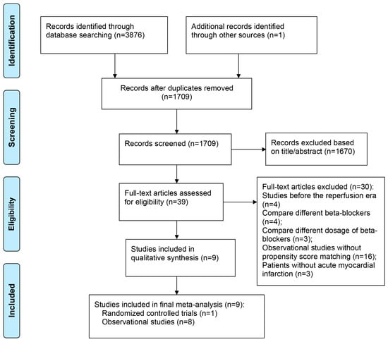 Nine studies containing 47,339 patients (24,329 patients received beta-blockers, whereas 23,010 patients did not) were included in the present meta-analysis, including one RCT [] and eight observational studies [,,,,,,,]. Details of the screening process for eligible studies are shown in Figure 1, and the baseline characteristics of the included studies and patients are presented in Table 1.