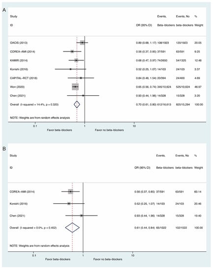 Some limitations associated with the meta-analysis deserve attention. Firstly, only one RCT was included in our meta-analysis. The inclusion of observational studies may have biased our pooled estimates, because of the effect of confounding factors. We tried to limit this bias by only including data with propensity score matching. Secondly, statistical heterogeneity was high in MACE, which may be related to the different definitions of MACE. Thirdly, the types of beta-blockers were varied, and the dosages of beta-blockers were not available, which may have affected clinical outcomes. However, according to the randomized Carvedilol Acute Myocardial Infarction Study, different types of beta-blockers (carvedilol versus atenolol) had no effect on composite cardiovascular events (p = 0.99) []. In addition, there was no significant benefit from high-dose (≥25% of target dose) compared to low-dose (<25% of target dose) beta-blockers, for cardiac death [].