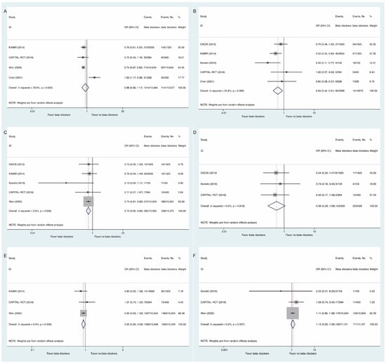 Comparisons of Secondary Outcomes Between Beta-Blockers and Controls: (A) major adverse cardiovascular events; (B) cardiac death; (C) myocardial infarction; (D) heart failure; (E) revascularization; (F) stroke.