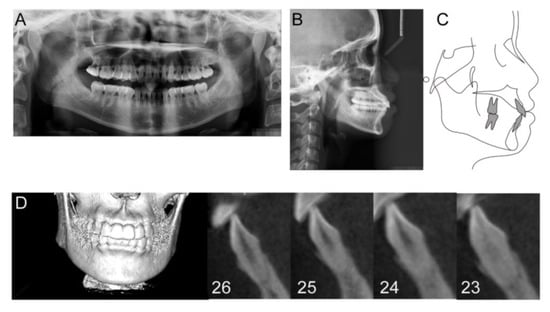 Pretreatment radiographs and cephalometric graph. (A) Panoramic radiograph; (B) Lateral cephalogram; (C) cephalometric tracings; (D) CBCT graphs.
