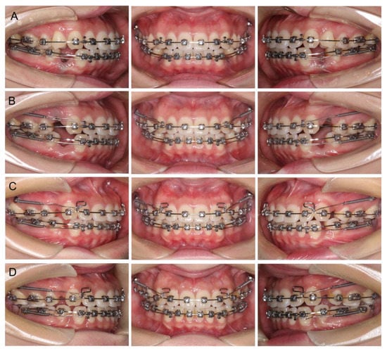 Clinical images of detailed treatment progress. (A) Retraction of the mandibular incisors immediately after the extraction of the premolars; (B) retraction of the maxillary incisors immediately after the extraction of the premolars; (C) before surgery; (D) space closure continued after surgery.