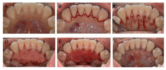 Clinical images of augmented corticotomy of the lingual side. (A) Initial intraoral image; (B) papillary preservation incisions; (C) piezoelectric corticotomy; (D) placement of bone grafts; (E) placement of bioabsorbable collagen membrane; (F) sutures.