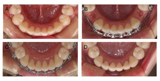 Pretreatment and posttreatment mandibular anterior teeth on lingual side. (A) Initial visit; (B) extraction of mandibular first premolars; (C) after augmented corticotomy; (D) orthodontic treatment completed.