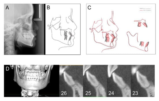 Posttreatment cephalometric graphs and CBCT graphs. (A) Lateral cephalogram; (B) cephalometric tracings; (C) cephalometric superimposition; (D) CBCT graphs.