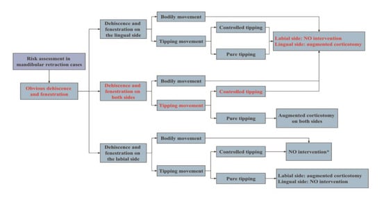 Decision tree for the management of mandibular incisor-retraction cases. * Extensive retraction may move teeth out of the bony housing, resulting in lingual bony defects, in which augmented corticotomy may be required despite no dehiscence and fenestration on the lingual side.