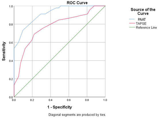 ROC curve using baseline PAAT and TAPSE values for prediction of severe pulmonary hypertension (PAAT: pulmonary artery acceleration time; TAPSE: tricuspid annular plane systolic excursion).
