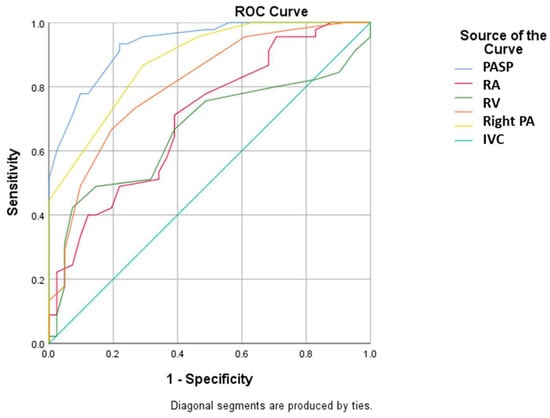 ROC curve using baseline PASP, RA, RV, right PA diameter and IVC values for prediction of severe pulmonary hypertension (PASP: pulmonary arterial systolic pressure; RA: right atrium; RV: right ventricle; PA: pulmonary artery; IVC: inferior vena cava).